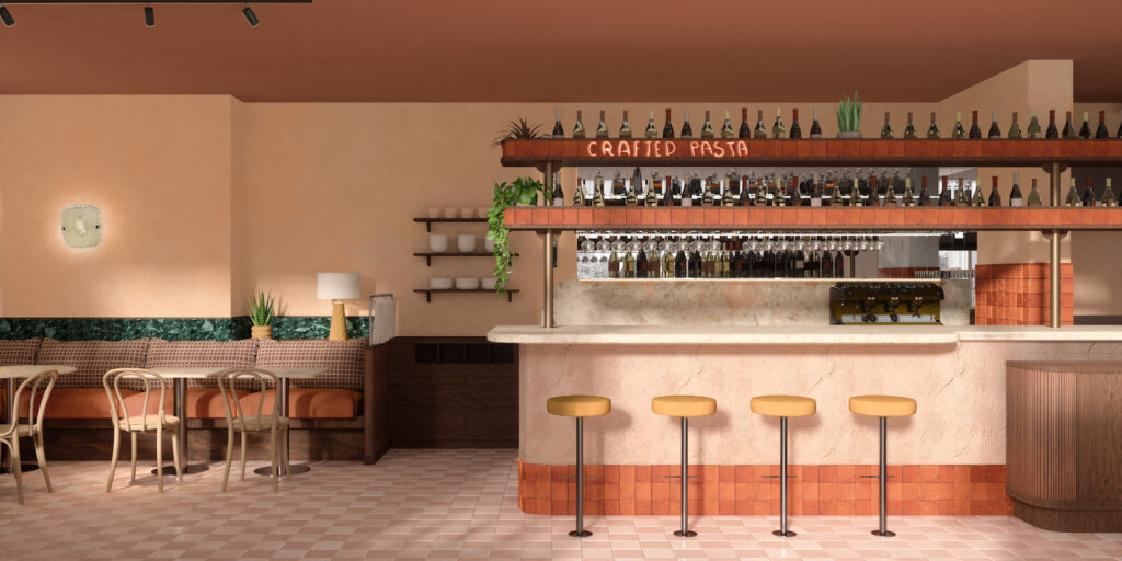 The open kitchen counter with seating will allow diners to enjoy the theatrics of food being freshly prepared, alongside live pasta making station – also visible from the outside of the building – will add further buzz and entertainment.