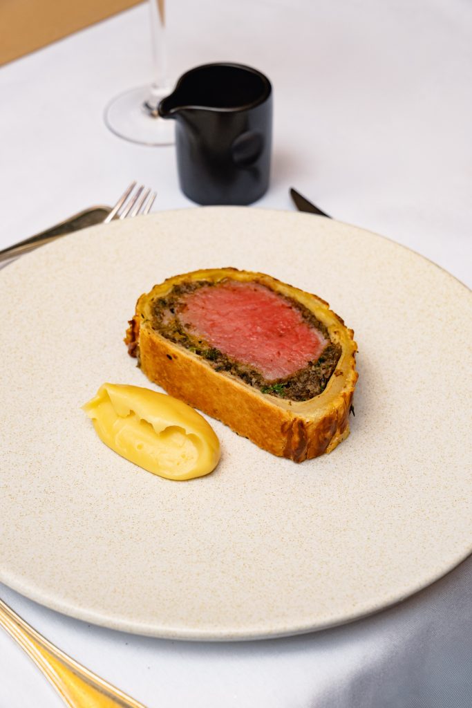 Starters include Braised Wild Boar Tortelloni or King Scallop, followed by a choice of two standout mains: a timeless Classic Beef Wellington or delicate Monkfish Medallion. A pre-dessert Kir Royale and a Coffee Entremont bring the meal to a celebratory close.