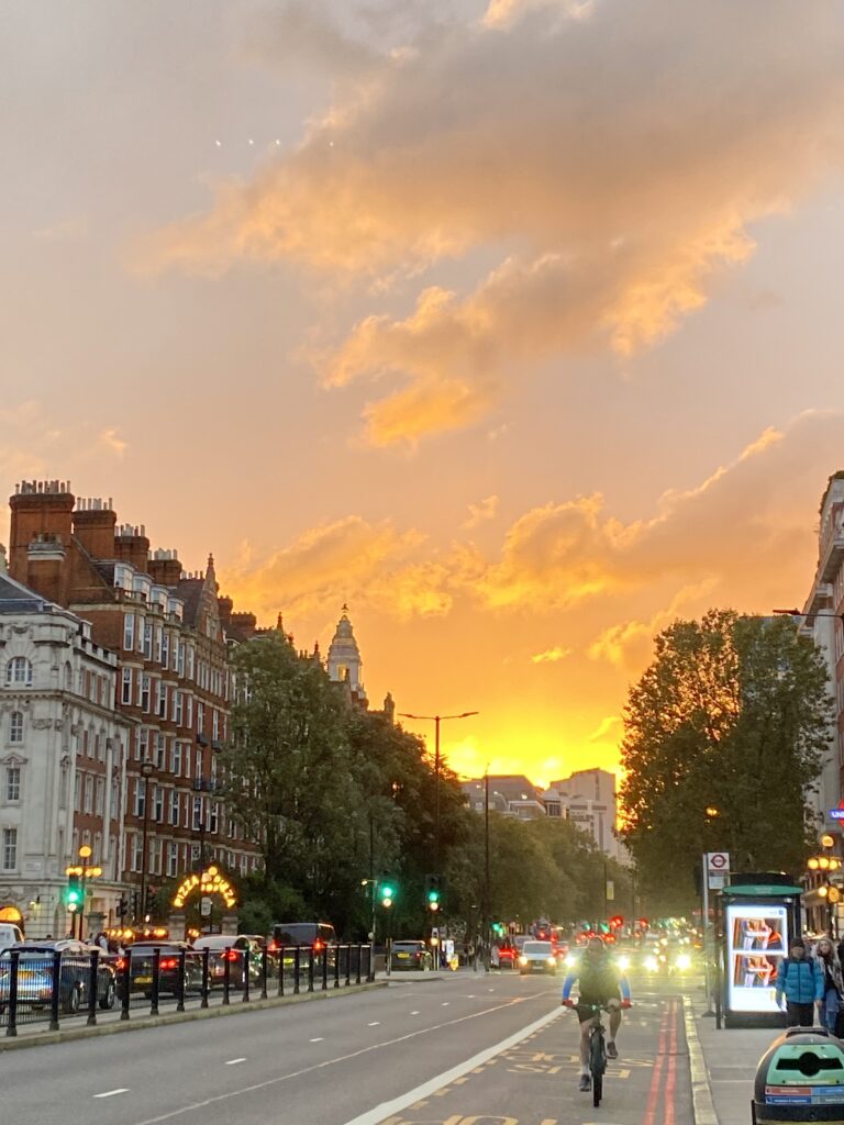 The sky was illuminated in layered tones of orange, peach, and gold, casting a warm glow across the architecture and trees of Marylebone.