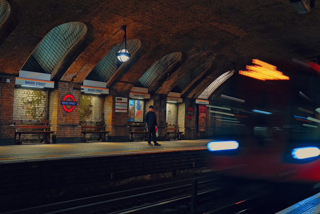 Over 20 million people use Baker Street Station every year from across the world. Chance meetings, conscious and unconscious, take place every second as we swarm down escalators and onto trains. Two shadows overlap and unknowingly hold hands for a moment as they go up the stairs then disappear forever into the chaos of the city.”